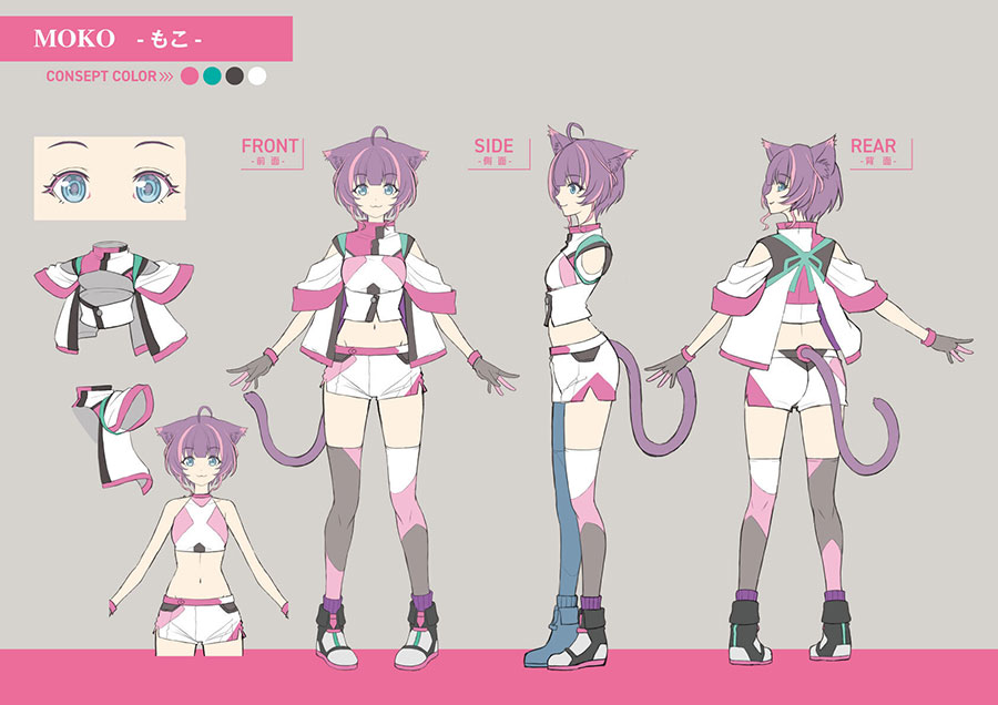 特にこだわった部分は、やはりコスチュームです。3人ともテーマは同じでも、キャラクターによって各々デザインが違うんです。あかりとしおんは左右反転した衣装ですが、襟元が違ったり、スカートの構造が違ったりしています。もこは両方に振袖があるんです。シルエットだけでも誰が誰か判別できるようになっています。単純にデザインを変えただけじゃなく実はキャラクターの性格などにも影響しているかも?